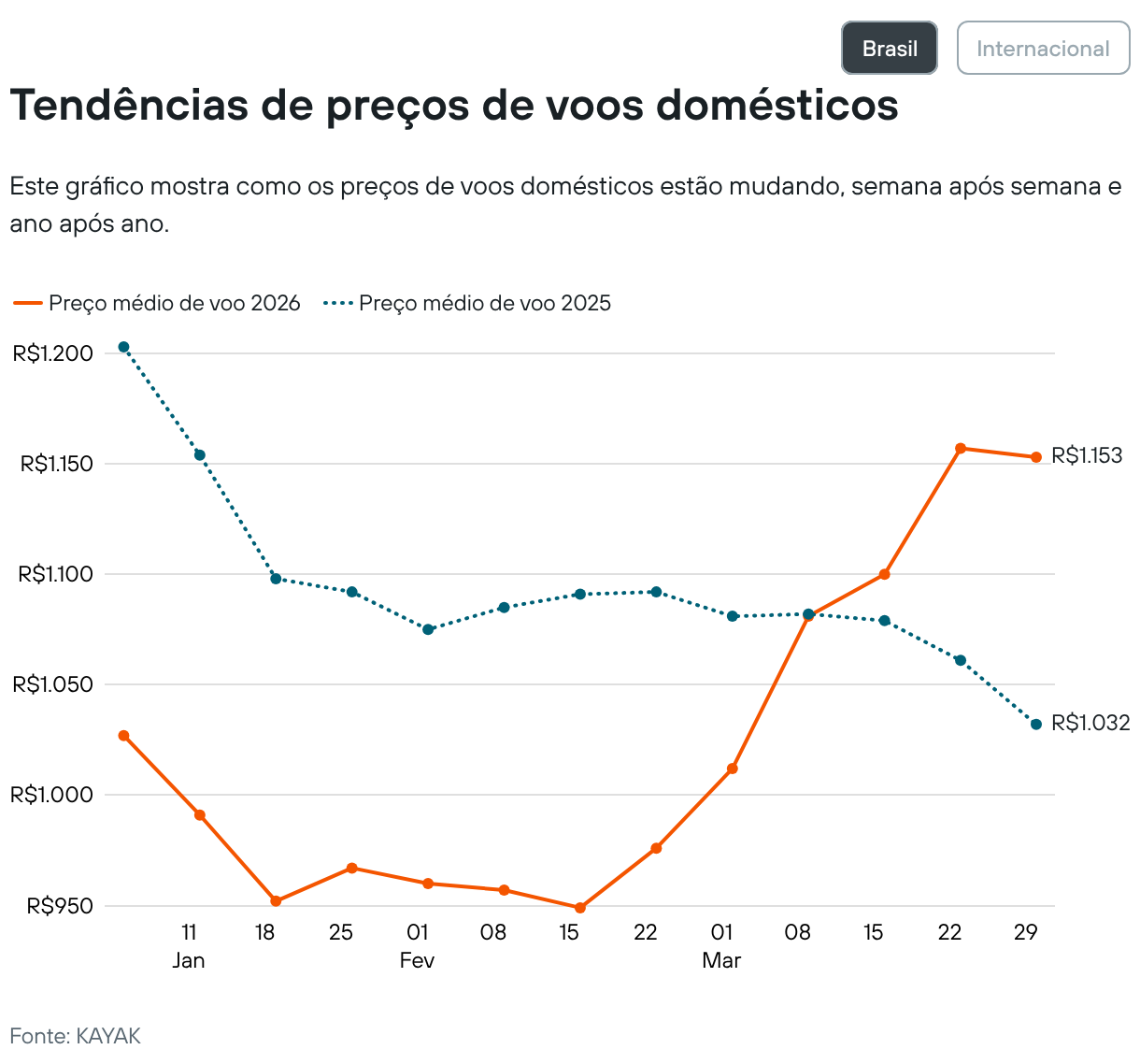 Brasil Internacional Tendências de preços de voos domésticos Este gráfico mostra como os preços de voos domésticos estão mudando, semana após semana e ano após ano.