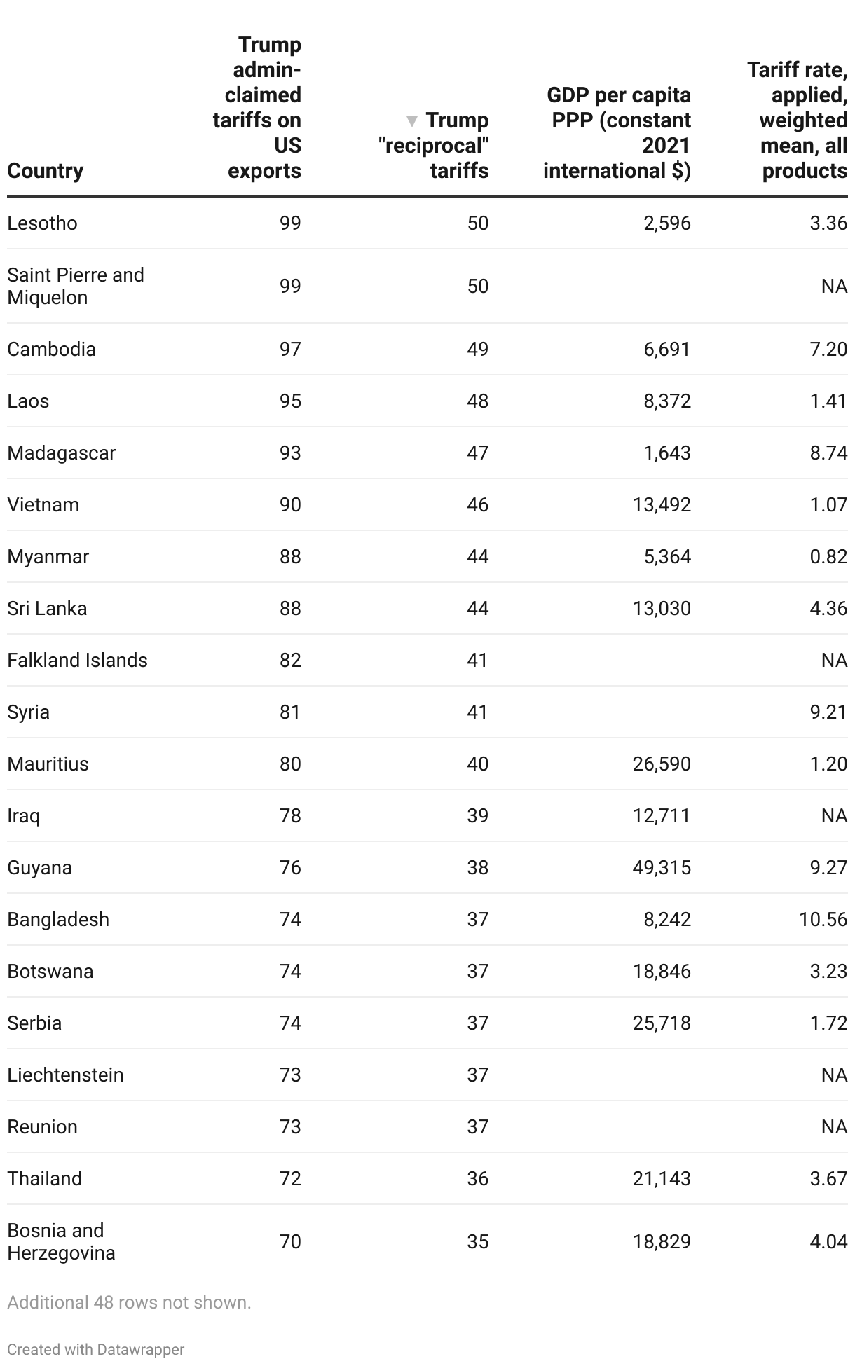 Trump admin-listed counties with claimed tariffs on exports of >10%, sorted by applied "reciprocal" tariff