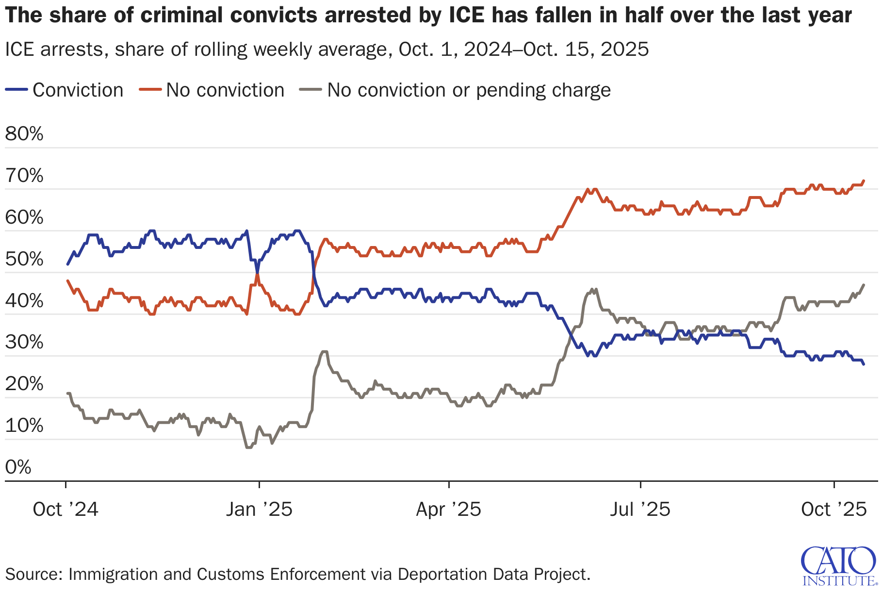ICE arrests, share of rolling weekly average, Oct. 1, 2024–Oct. 15, 2025