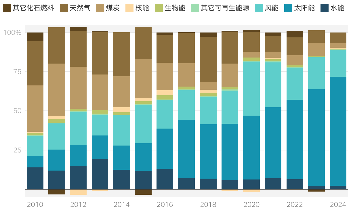 2020-2024年,不同能源类型在新增装机容量中的占比(以百分比计)