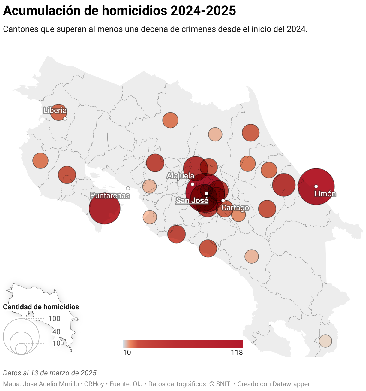 Cantones que superan al menos una decena de crímenes desde el inicio del 2024.