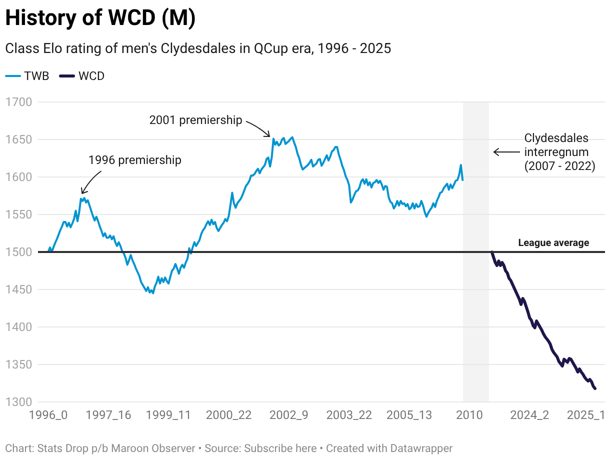 Class Elo rating of men's Clydesdales in QCup era, 1996 - 2025