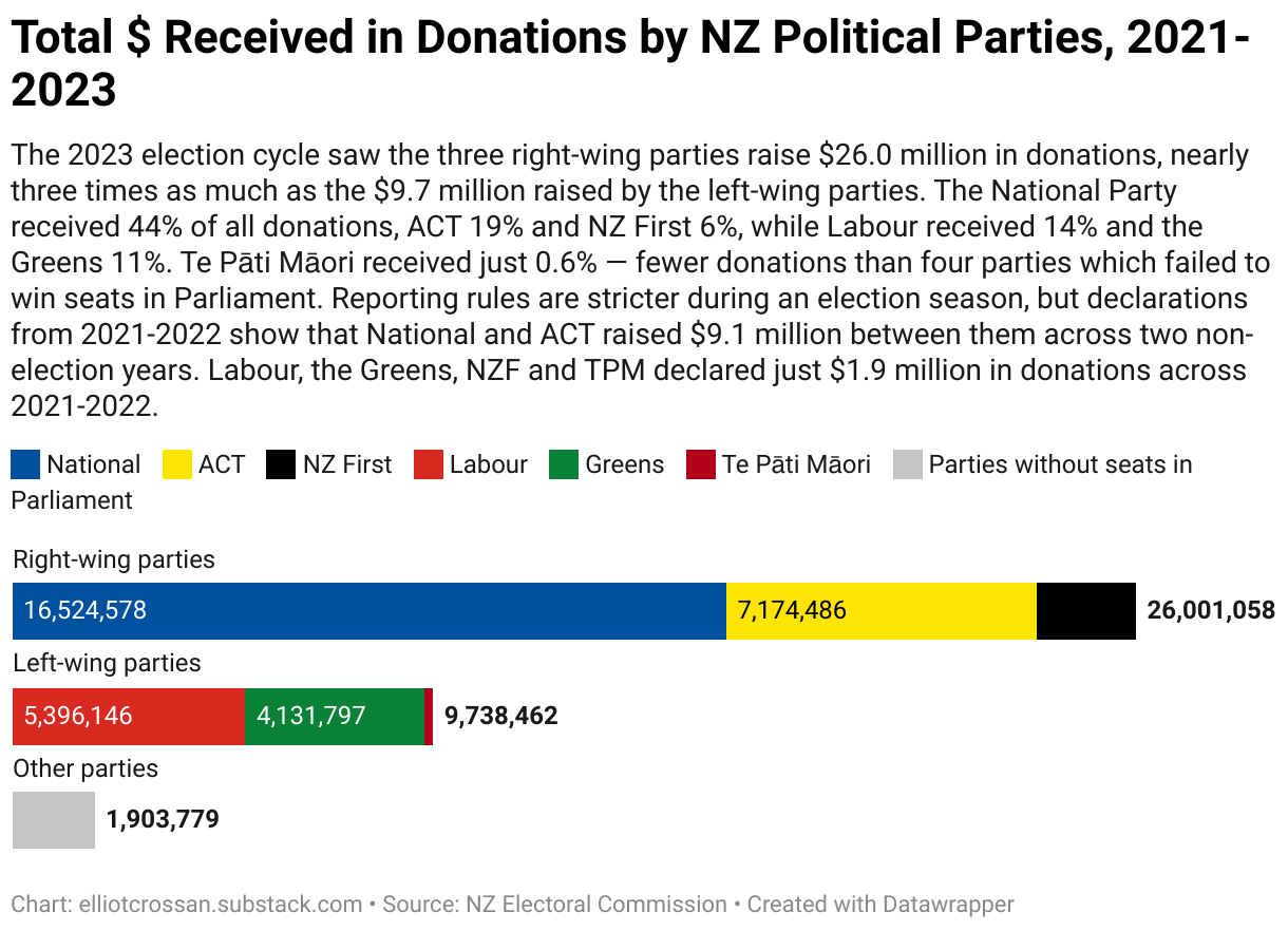 The 2023 election cycle saw the three right-wing parties raise $26.0 million in donations, nearly three times as much as the $9.7 million raised by the left-wing parties. The National Party received 44% of all donations, ACT 19% and NZ First 6%, while Labour received 14% and the Greens 11%. Te Pāti Māori received just 0.6% — fewer donations than four parties which failed to win seats in Parliament. Reporting rules are stricter during an election season, but declarations from 2021-2022 show that National and ACT raised $9.1 million between them across two non-election years. Labour, the Greens, NZF and TPM declared just $1.9 million in donations across 2021-2022.