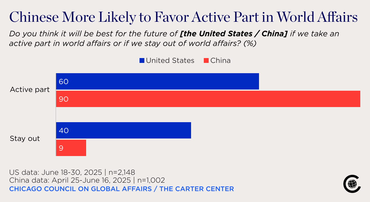 Do you think it will be best for the future of [the United States / China] if we take an active part in world affairs or if we stay out of world affairs? (%)