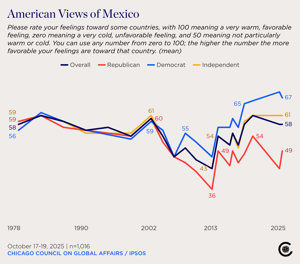 Please rate your feelings toward some countries, with 100 meaning a very warm, favorable feeling, zero meaning a very cold, unfavorable feeling, and 50 meaning not particularly warm or cold. You can use any number from zero to 100; the higher the number the more favorable your feelings are toward that country. (mean)