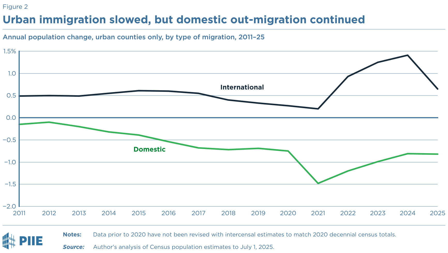 Annual population change, urban counties only, by type of migration, 2011–25