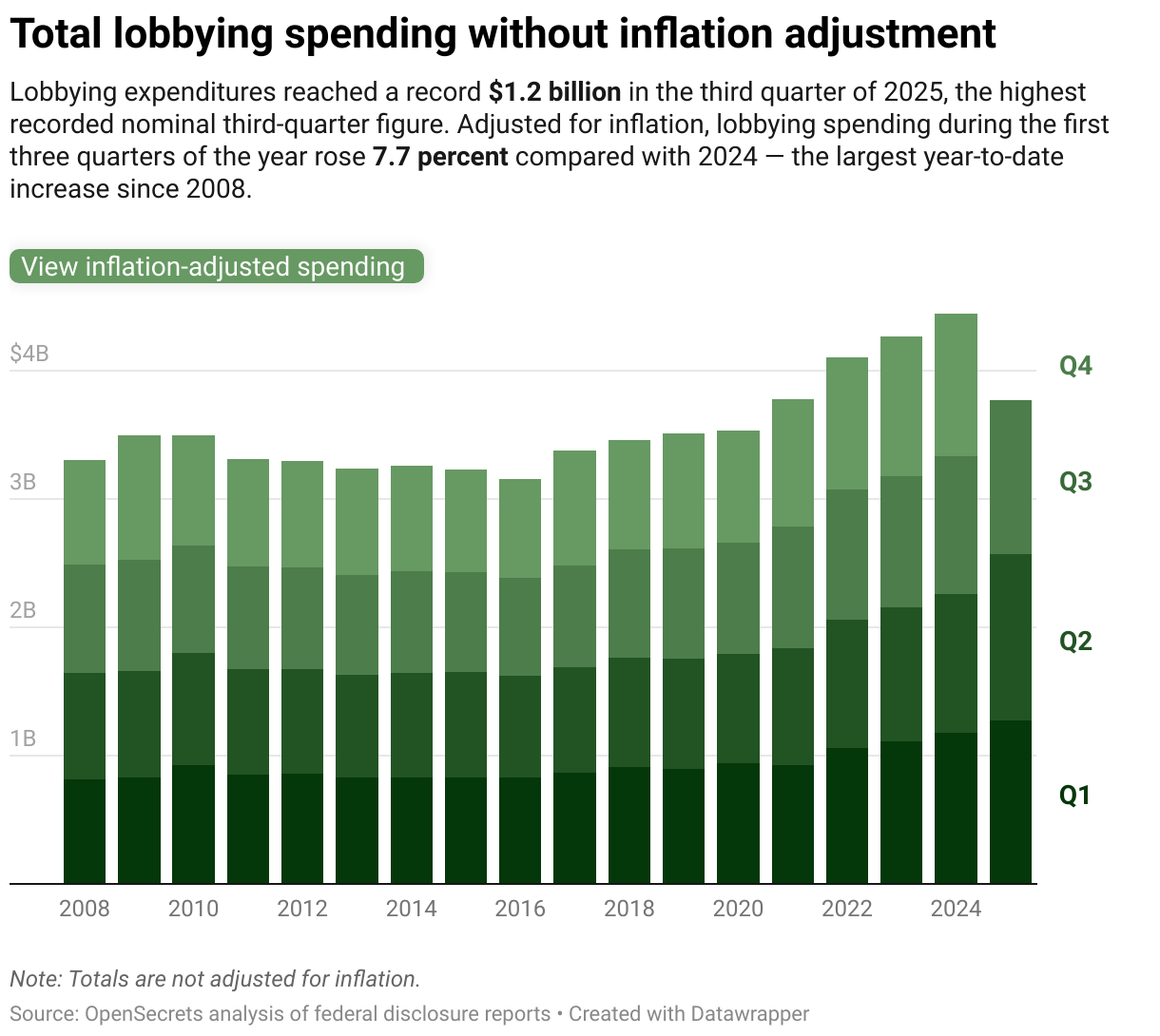 Lobbying expenditures reached a record $1.2 billion in the third quarter of 2025, the highest recorded nominal third-quarter figure. Adjusted for inflation, lobbying spending during the first three quarters of the year rose 7.7 percent compared with 2024 — the largest year-to-date increase since 2008.