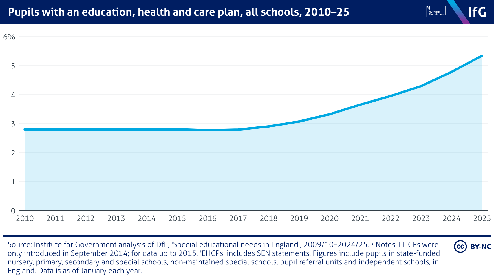 A line chart from the Institute for Government of pupils with an education, health and care plan, all schools, 2010–25, where the share of pupils with an EHCP has risen steadily since 2017. After holding at 2.8% between 2010 and 2017, the proportion has climbed steadily to 5.3% in 2025.