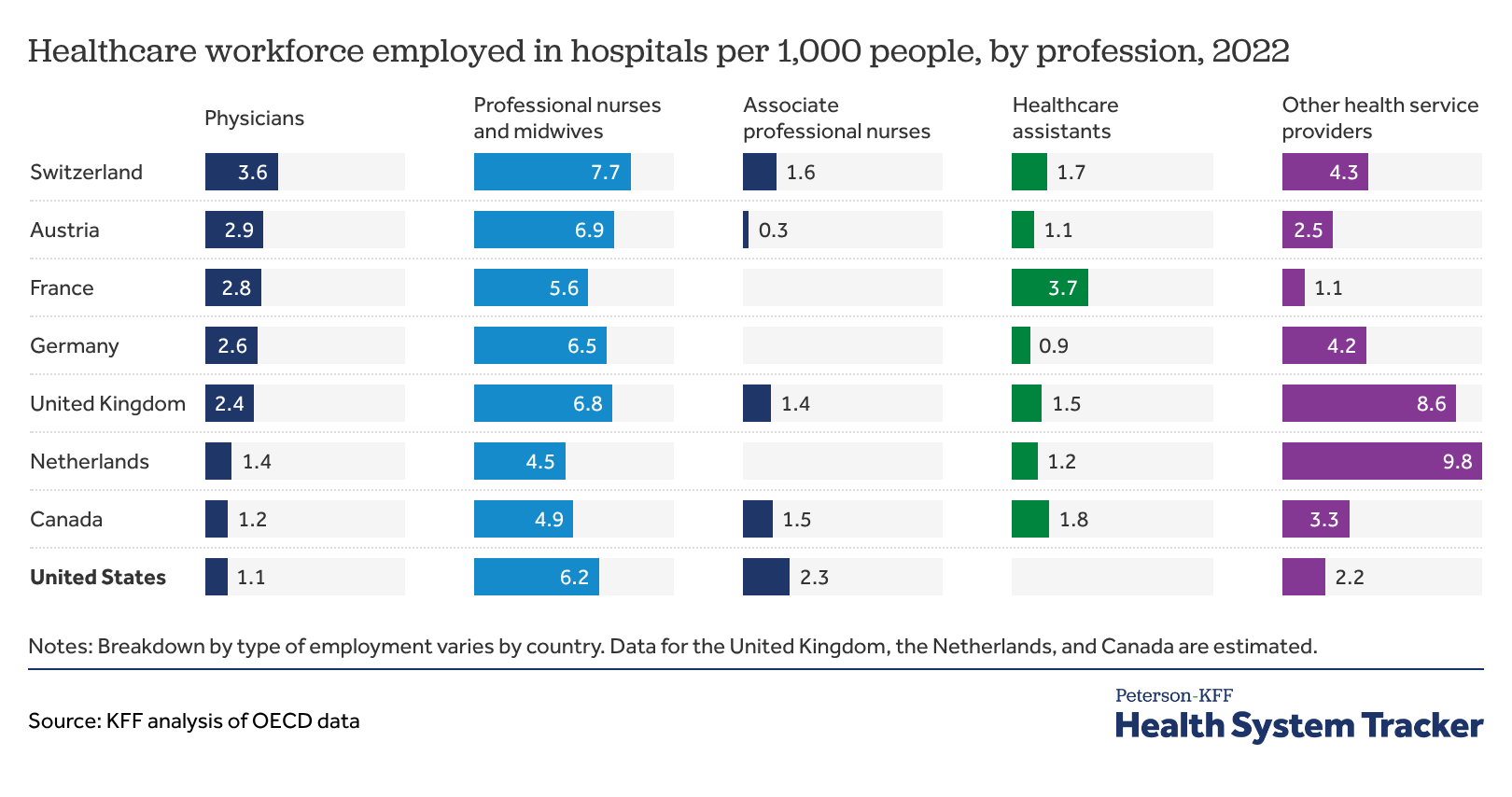 Healthcare workforce employed in hospitals per 1,000 people, by profession, 2022