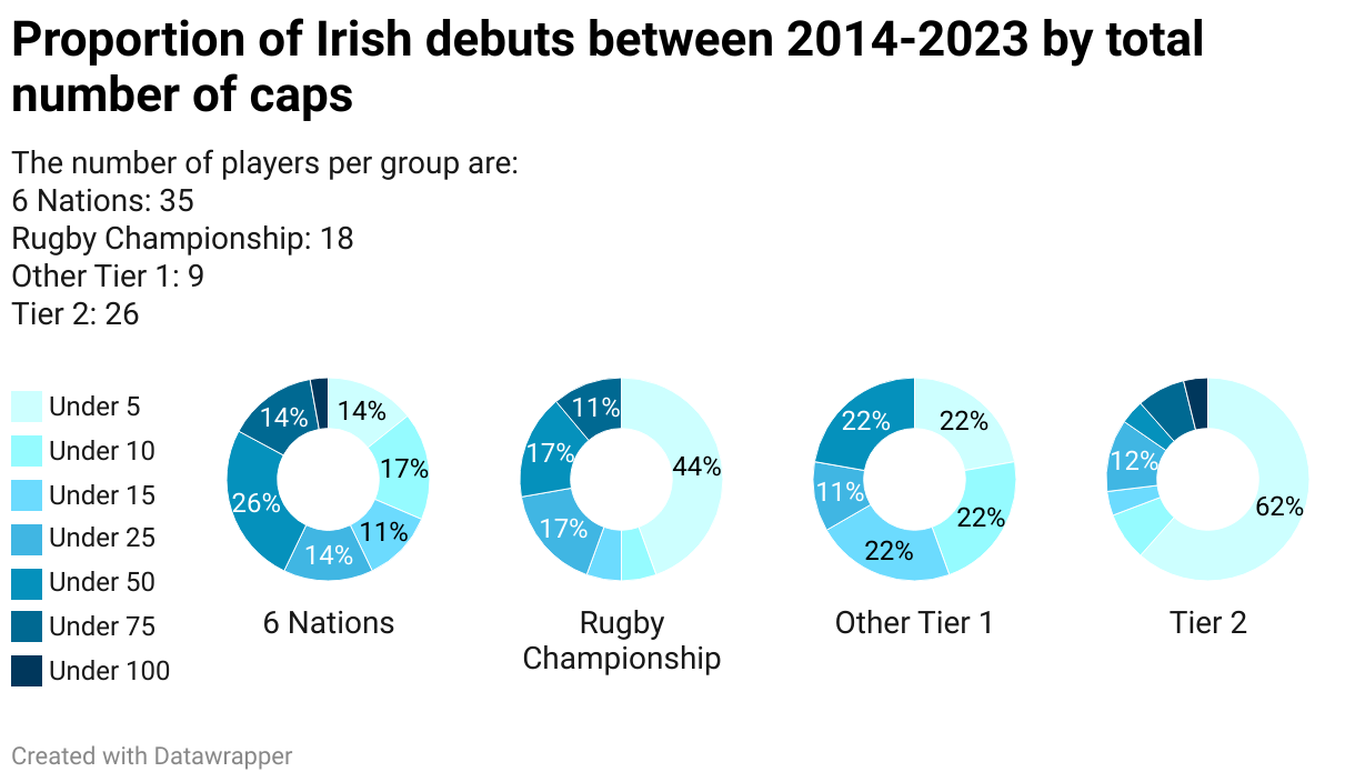 The number of players per group are: 6 Nations: 35 Rugby Championship: 18 Other Tier 1: 9 Tier 2: 26