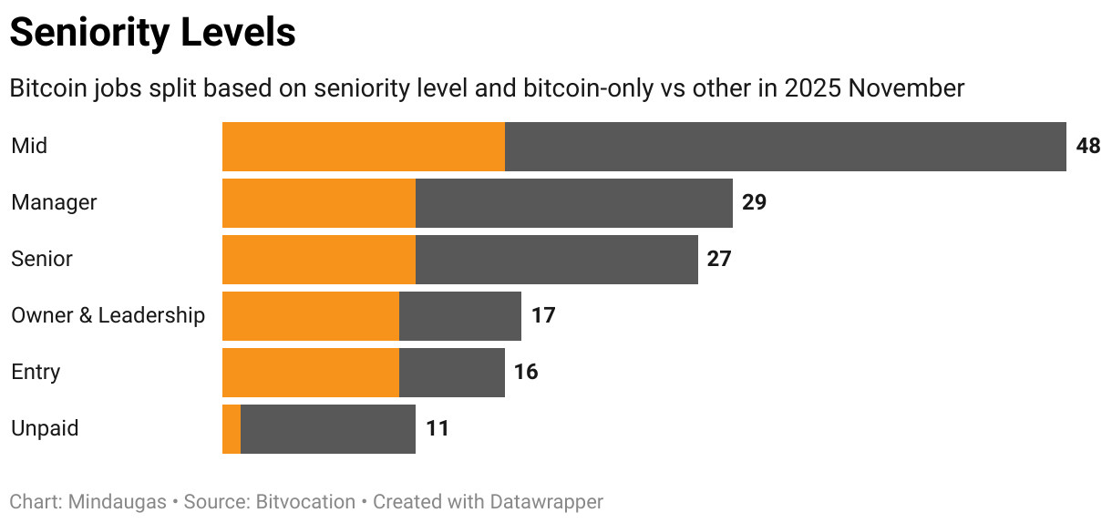 Bitcoin jobs split based on seniority level and bitcoin-only vs other in 2025 November