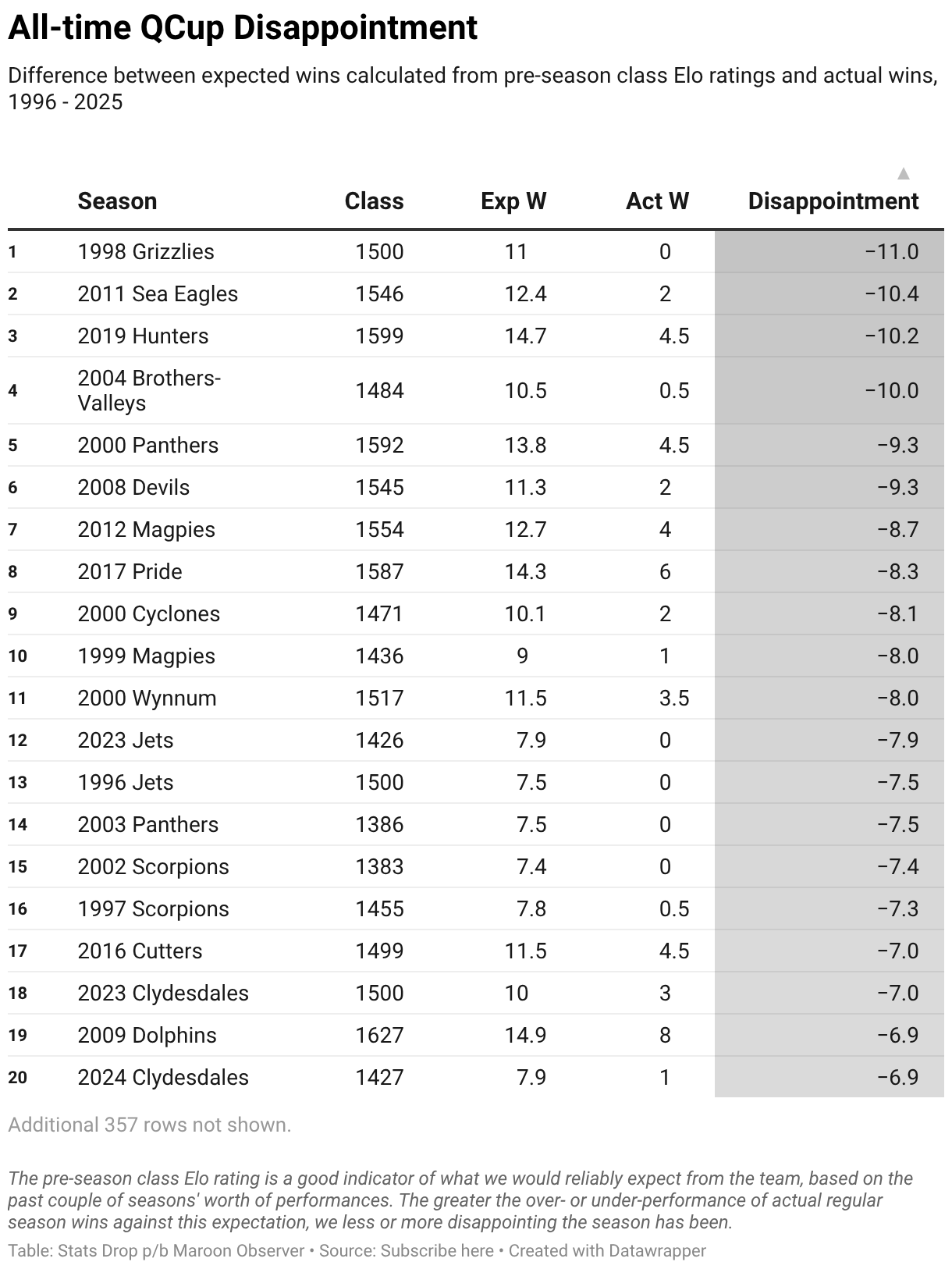 Difference between expected wins calculated from pre-season class Elo ratings and actual wins, 1996 - 2025
