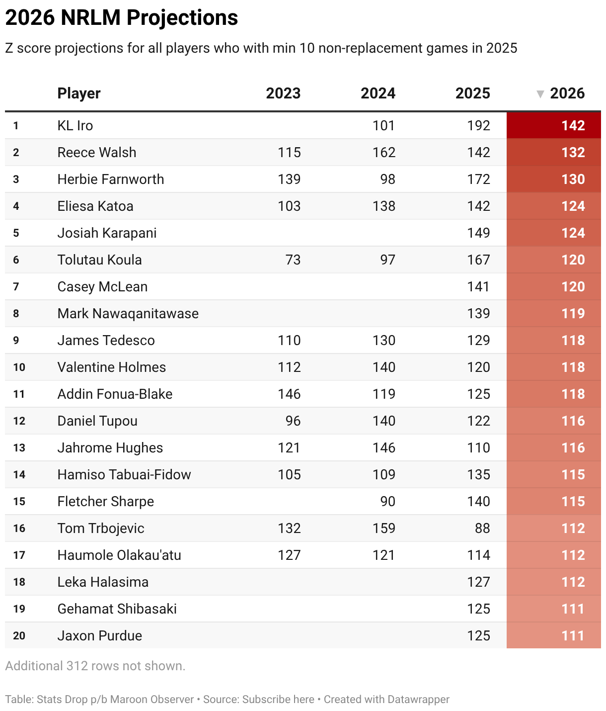 Z score projections for all players who with min 10 non-replacement games in 2025