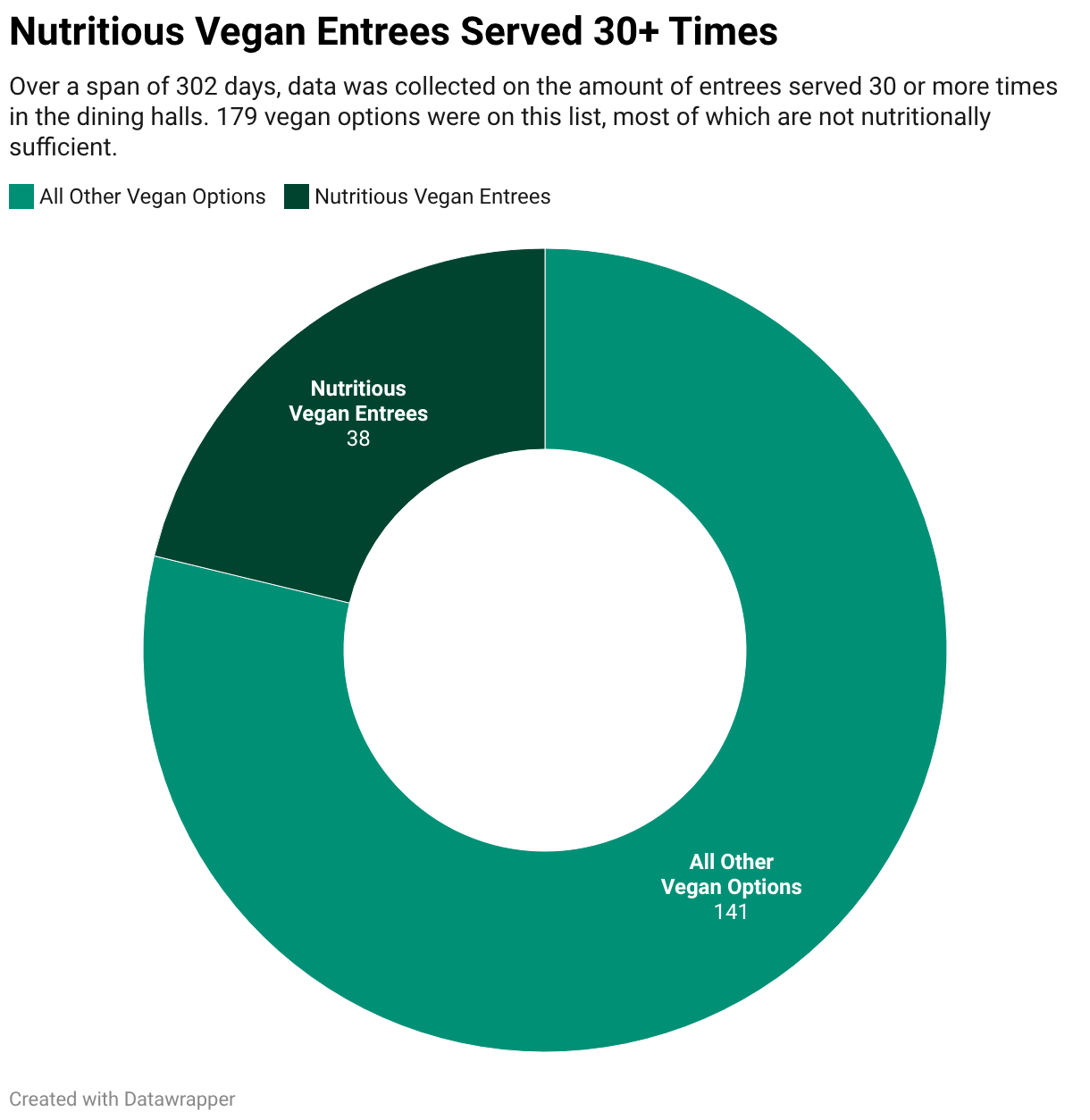 Over a span of 302 days, data was collected on the amount of entrees served 30 or more times in the dining halls. 179 vegan options were on this list, most of which are not nutritionally sufficient.