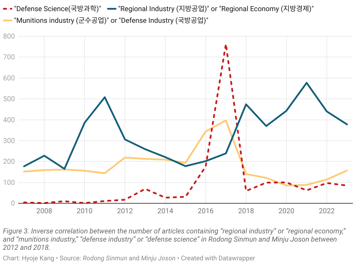 Figure 3. Inverse correlation between the number of articles containing “regional industry” or “regional economy,” and “munitions industry,” “defense industry” or “defense science” in Rodong Sinmun and Minju Joson between 2012 and 2018.