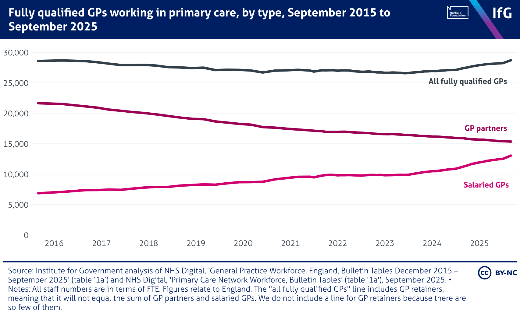 A line chart from the Institute for Government showing Fully qualified GPs working in primary care, by type, September 2015 to September 2025, where the number of GP partners steadily declines from around 21,600 in 2015 to 15,0300 in 2025, while salaried GPs rise from nearly 7,000 to just over 13,000. The total number of fully qualified GPs remains broadly stable, ending at 28,703 in 2025.