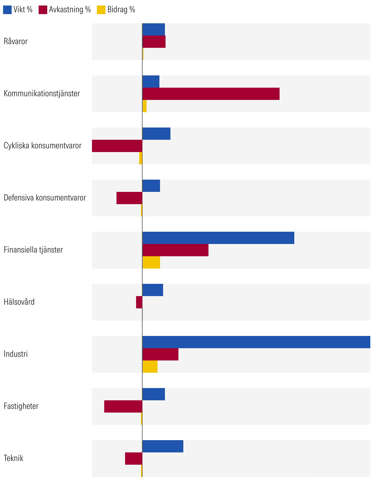 Illustrerar respektive sektors vikt i Morningstar Sweden Index, avkastning sedan årsskiftet samt hur mycket de bidragit till indexets utveckling sedan årsskiftet