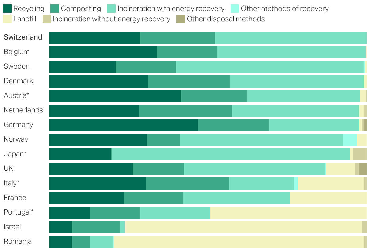 Waste treatment methods (% of waste treated) in a selection of countries, in 2022 or 2021*.