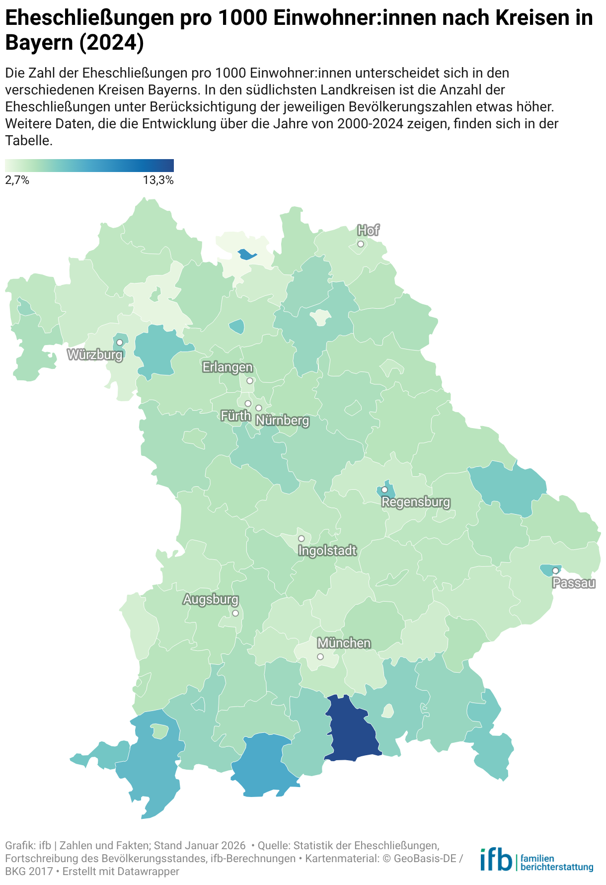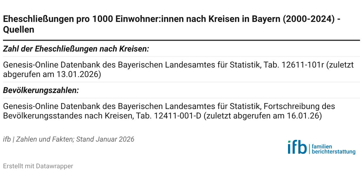 Die Zahl der Eheschließungen pro 1000 Einwohner:innen unterscheidet sich in den verschiedenen Kreisen Bayerns. In den südlichsten Landkreisen ist die Anzahl der Eheschließungen unter Berücksichtigung der jeweiligen Bevölkerungszahlen etwas höher. Weitere Daten, die die Entwicklung über die Jahre von 2000-2024 zeigen, finden sich in der Tabelle.