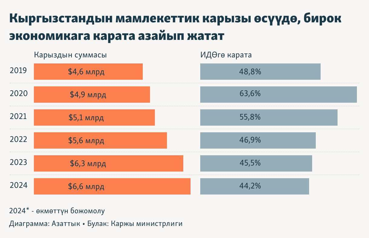 Кыргызстандын мамлекеттик карызы өсүүдө, бирок экономикага карата азайып жатат