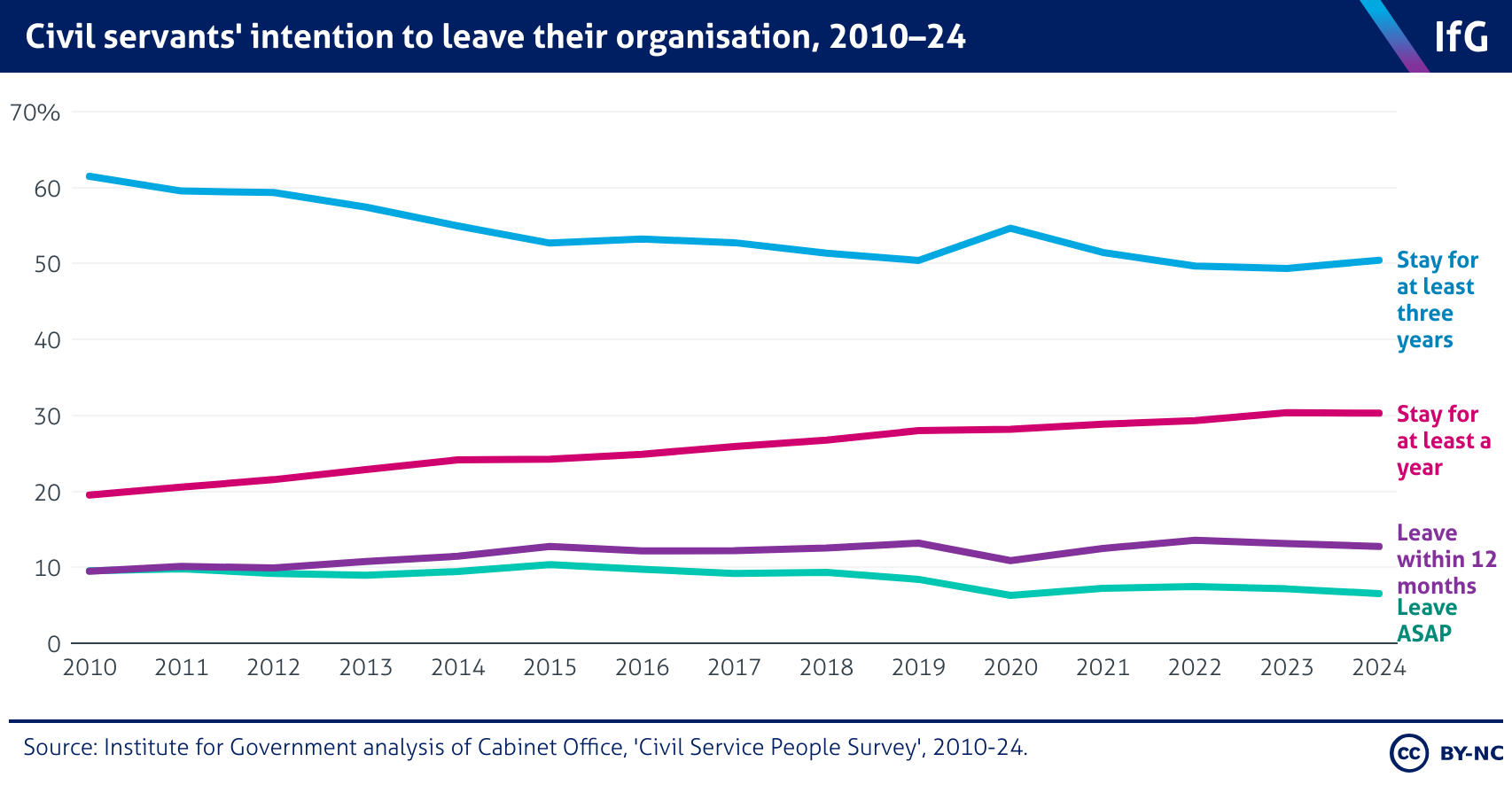A line chart from the Institute for Government showing civil service staff's intention to leave their organisation, 2009-23. Throughout this period most staff wish to stay for at least three years, though this proportion has declined over time. 10% or less want to leave their organisation as soon as possible throughout the period.