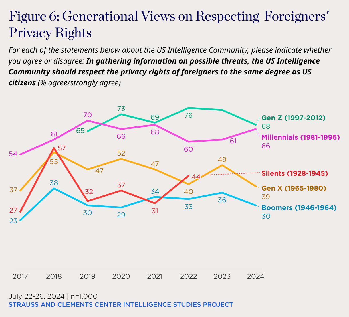 For each of the statements below about the US Intelligence Community, please indicate whether you agree or disagree: In gathering information on possible threats, the US Intelligence Community should respect the privacy rights of foreigners to the same degree as US citizens (% agree/strongly agree)