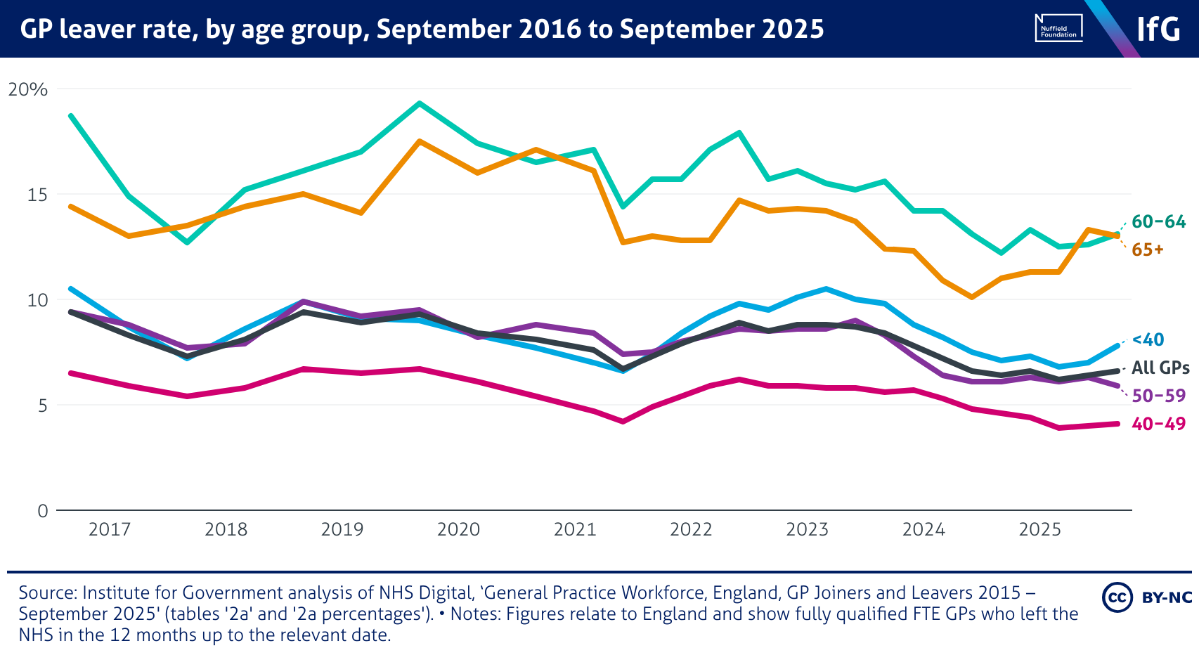 A line chart from the Institute for Government showing GP leaver rate, by age group, September 2016 to September 2025, where leaver rates are consistently highest among older GPs. Rates for those aged 60–64 fluctuate around 12-20%. In contrast, GPs under 50 have much lower and more stable rates, generally between 4% and 10%, with only minor variation over time.