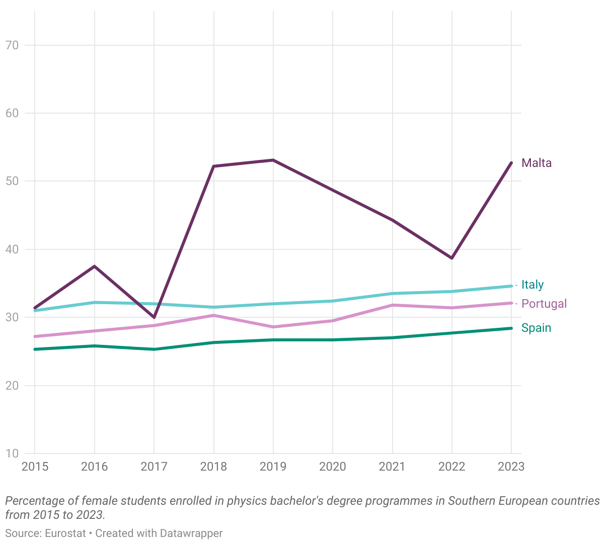 Percentage of female students enrolled in physics bachelor's degree programmes in Southern European countries from 2015 to 2023.