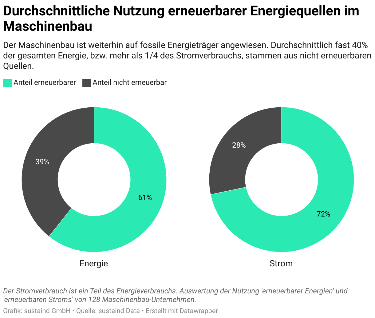 Der Maschinenbau ist weiterhin auf fossile Energieträger angewiesen. Durchschnittlich fast 40% der gesamten Energie, bzw. mehr als 1/4 des Stromverbrauchs, stammen aus nicht erneuerbaren Quellen.