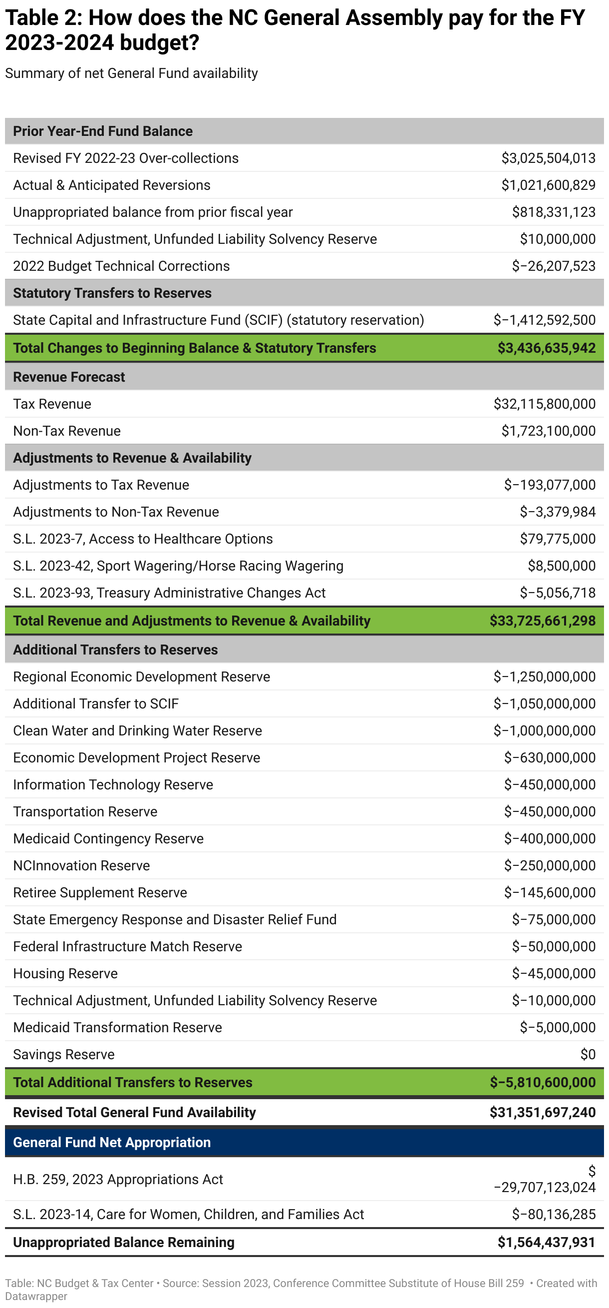 How does the NC General Assembly pay for the FY 2023-2024 budget? The budget is paid for through a combination of changes to the prior year-end fund balance, statutory transfers to reserves, updated information from the revenue forecast, adjustments to revenue and availability, and additional transfers to reserves.