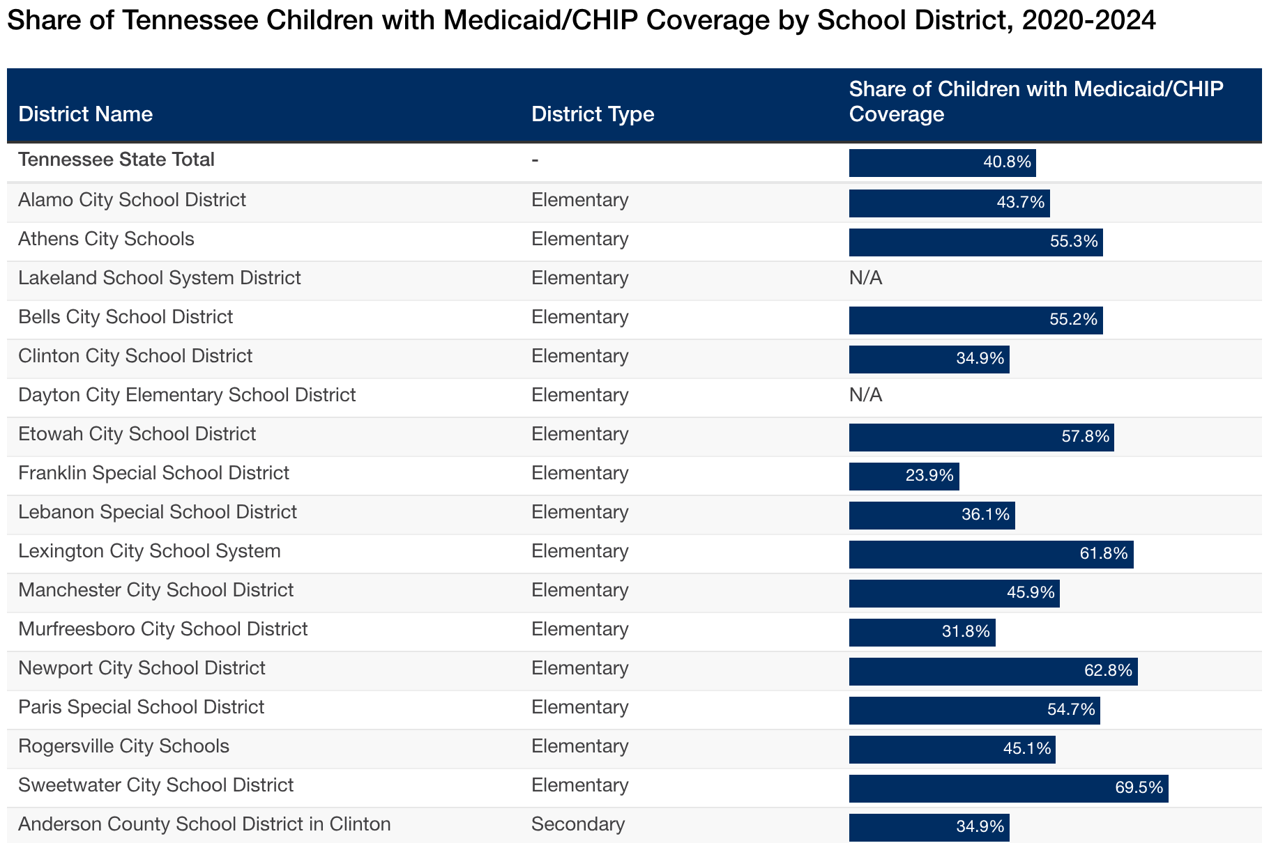 Share of Tennessee Children with Medicaid/CHIP Coverage by School District, 2020-2024