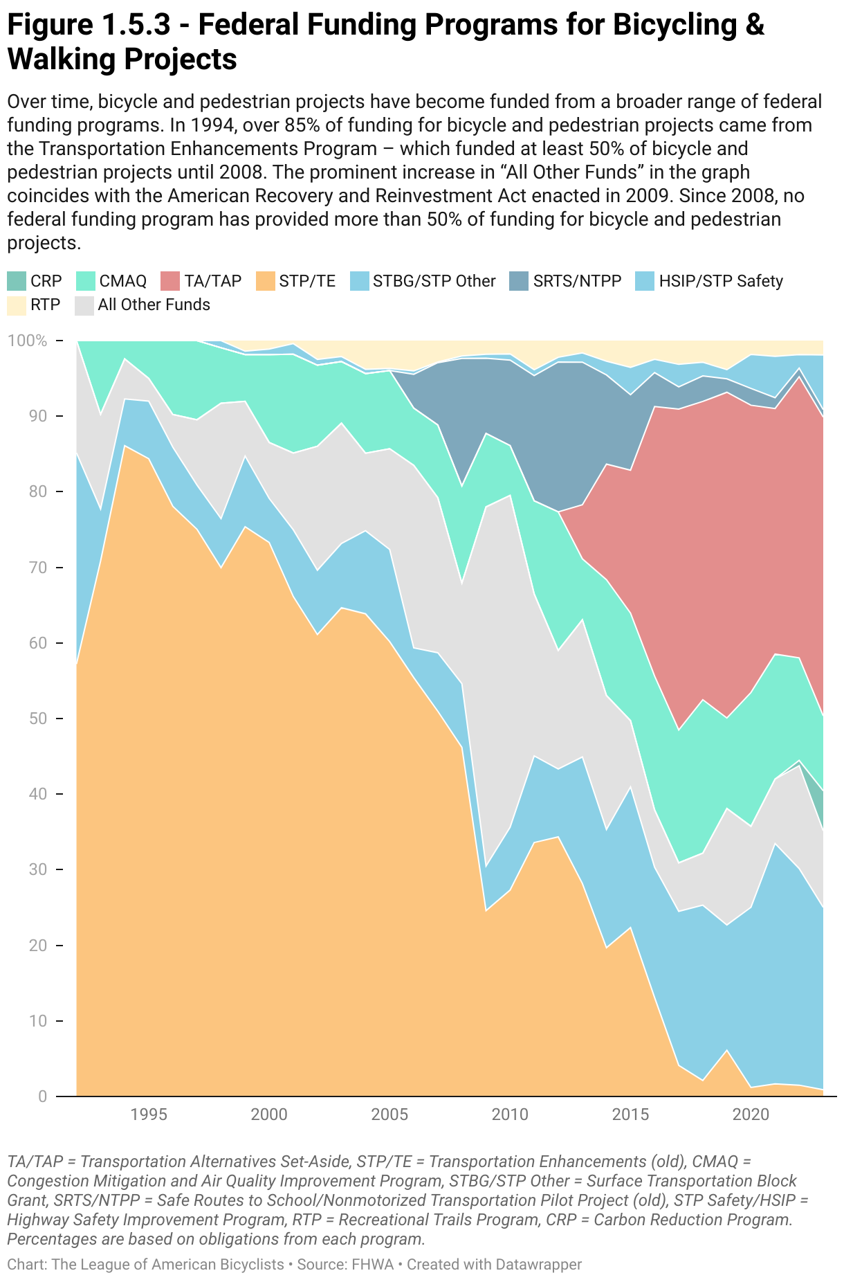 Over time, bicycle and pedestrian projects have become funded from a broader range of federal funding programs. In 1994, over 85% of funding for bicycle and pedestrian projects came from the Transportation Enhancements Program – which funded at least 50% of bicycle and pedestrian projects until 2008. The prominent increase in “All Other Funds” in the graph coincides with the American Recovery and Reinvestment Act enacted in 2009. Since 2008, no federal funding program has provided more than 50% of funding for bicycle and pedestrian projects.