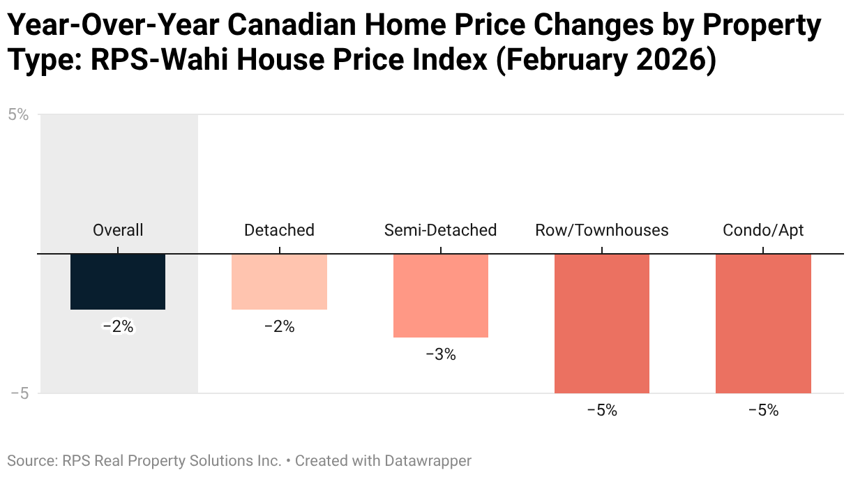 Year-Over-Year Canadian Home Price Changes by Property Type: RPS-Wahi House Price Index (February 2026)
