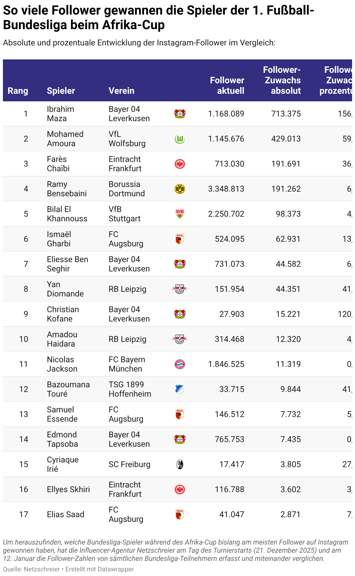 Absolute und prozentuale Entwicklung der Instagram-Follower im Vergleich: