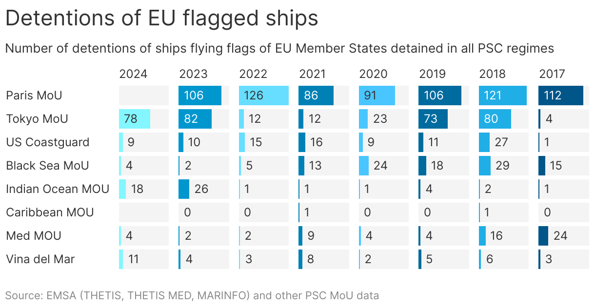 Number of detentions of ships flying flags of EU Member States detained in all PSC regimes