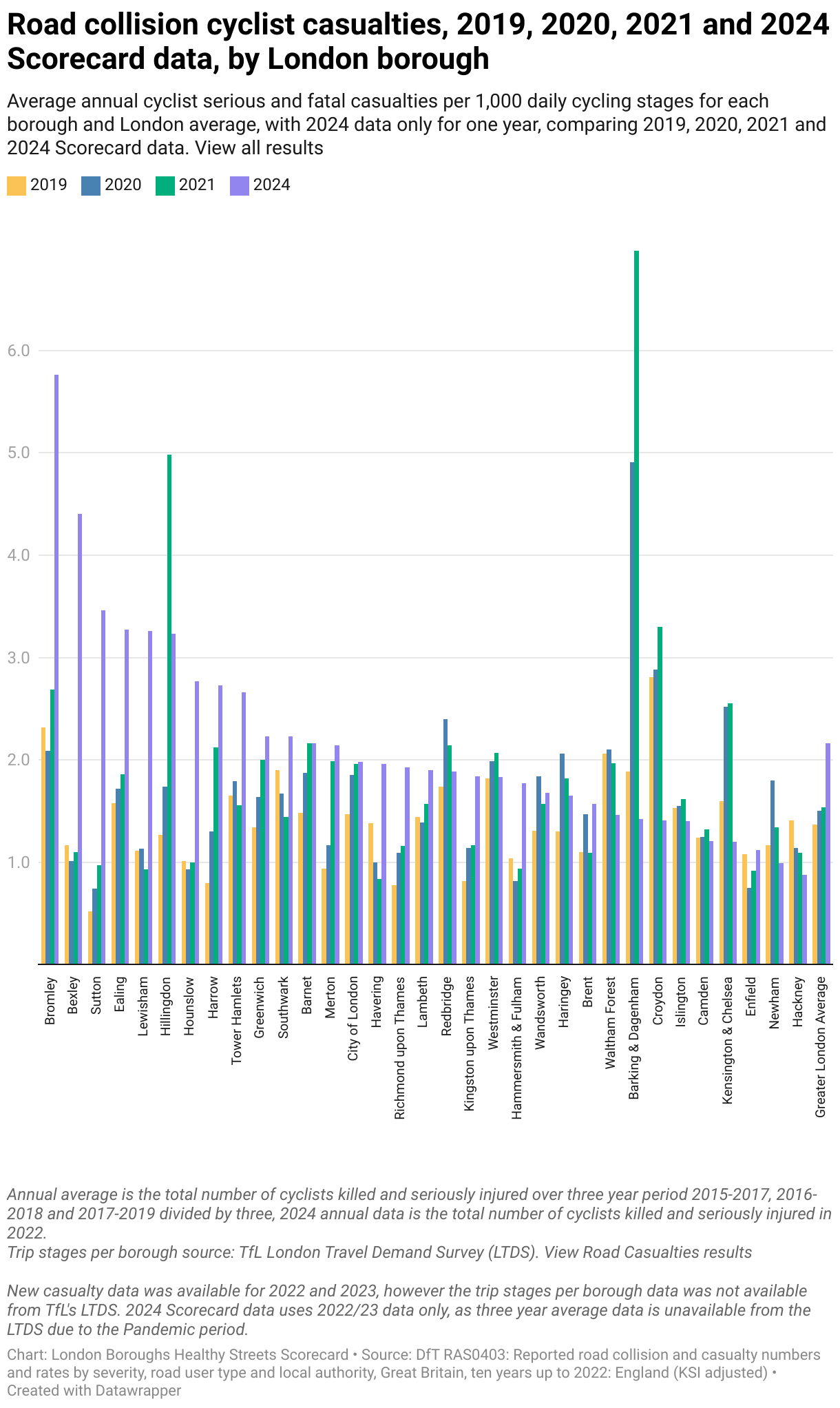 Average annual cyclist serious and fatal casualties per 1,000 daily cycling stages for each borough and London average, with 2024 data only for one year, comparing 2019, 2020, 2021 and 2024 Scorecard data. View all results