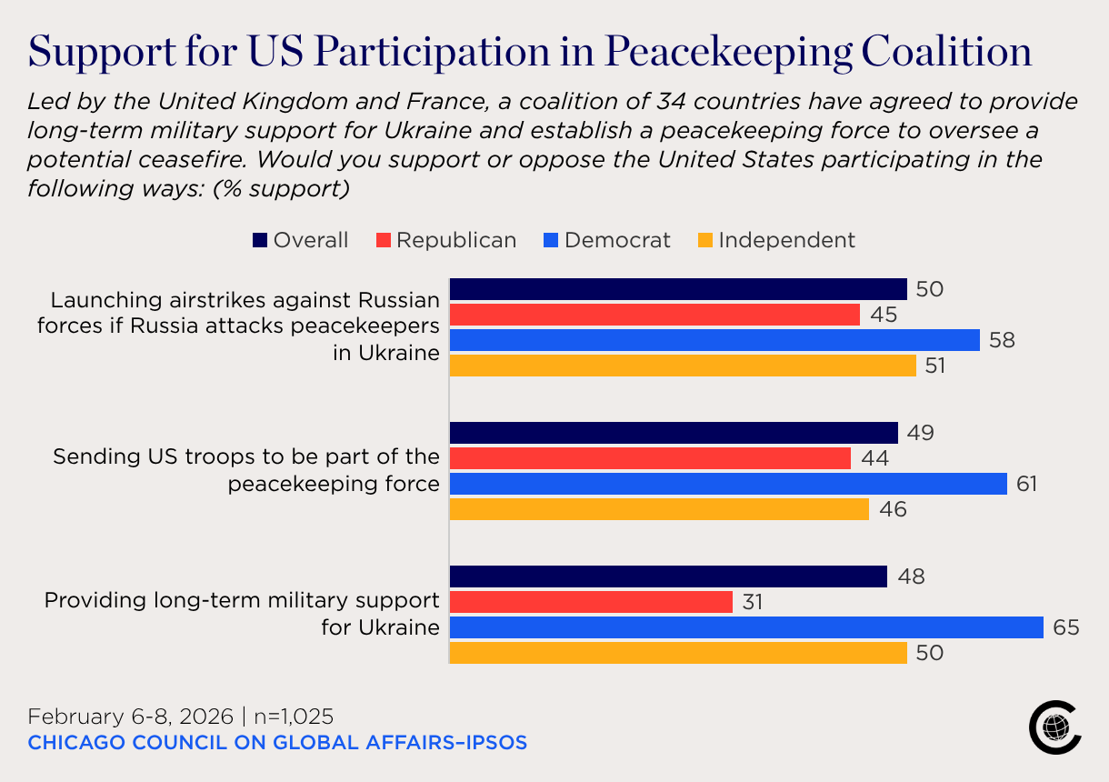 Led by the United Kingdom and France, a coalition of 34 countries have agreed to provide long-term military support for Ukraine and establish a peacekeeping force to oversee a potential ceasefire. Would you support or oppose the United States participating in the following ways: (% support)
