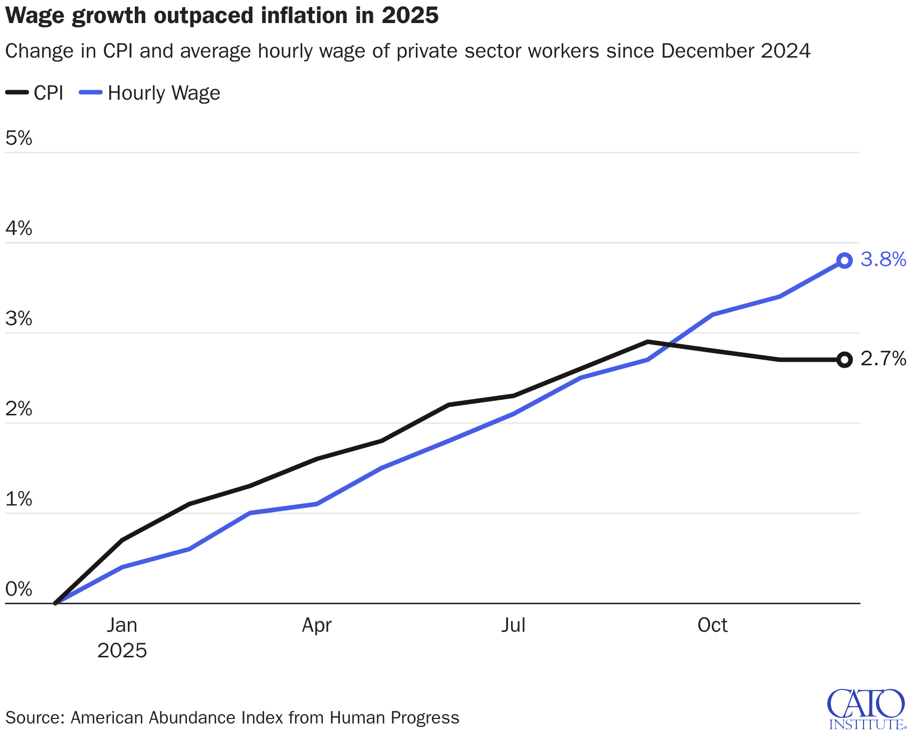 Change in CPI and average hourly wage of private sector workers since December 2024