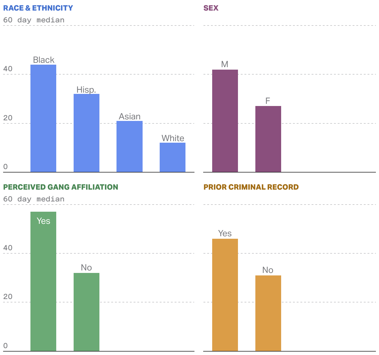 A grid of four bar charts describing the median number of days Chicago police take to clear a gun homicide including demographics like, race, sex, perceived gang affiliation and prior criminal record.