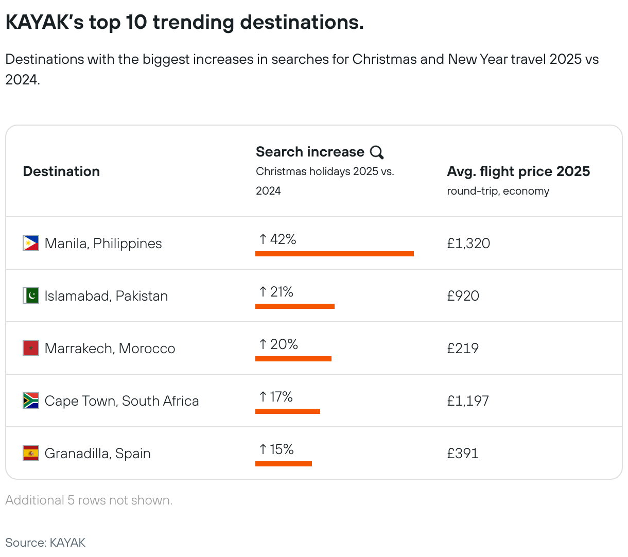 Destinations with the biggest increases in searches for Christmas and New Year travel 2025 vs 2024.