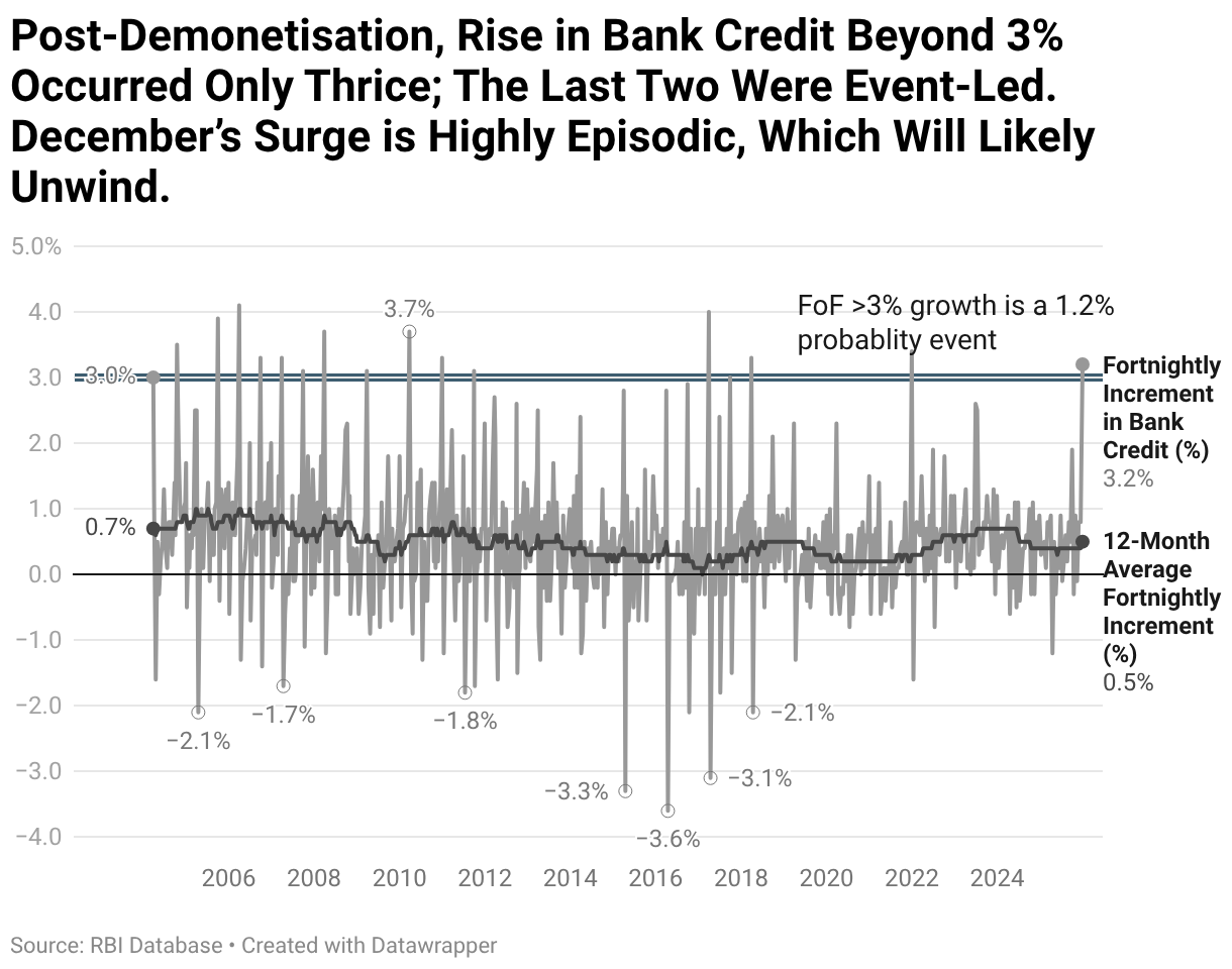 Post-Demonetisation, Rise in Bank Credit Beyond 3% Occurred Only Thrice; The Last Two Were Event-Led. December’s Surge is Highly Episodic, Which Will Likely Unwind.