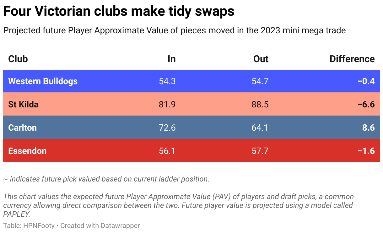 Projected future Player Approximate Value of pieces moved in the 2023 mini mega trade