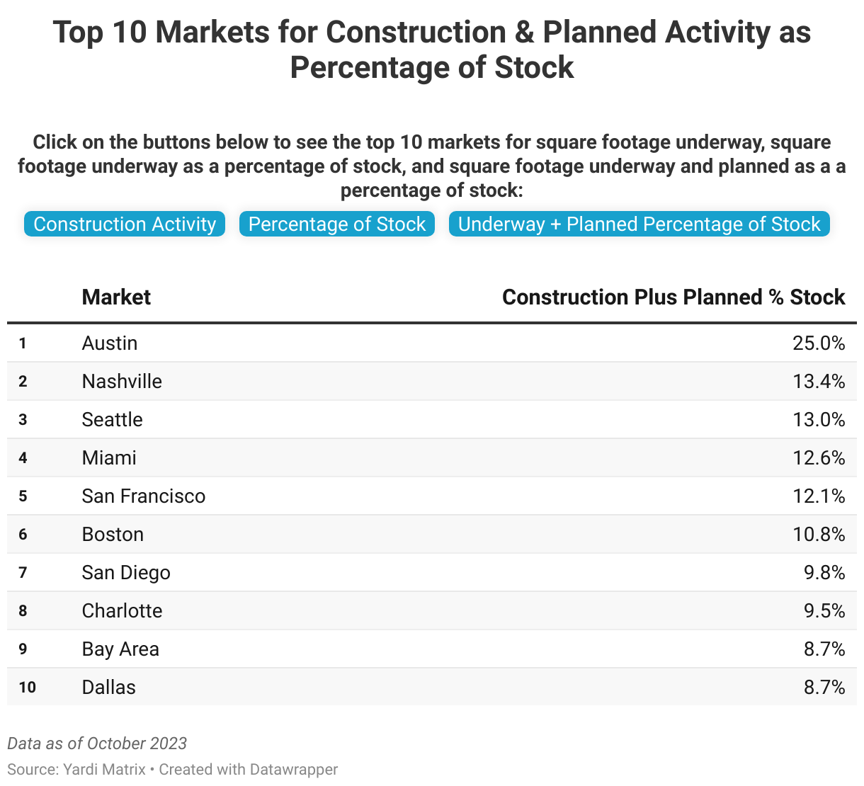 Click on the buttons below to see the top 10 markets for square footage underway, square footage underway as a percentage of stock, and square footage underway and planned as a a percentage of stock: