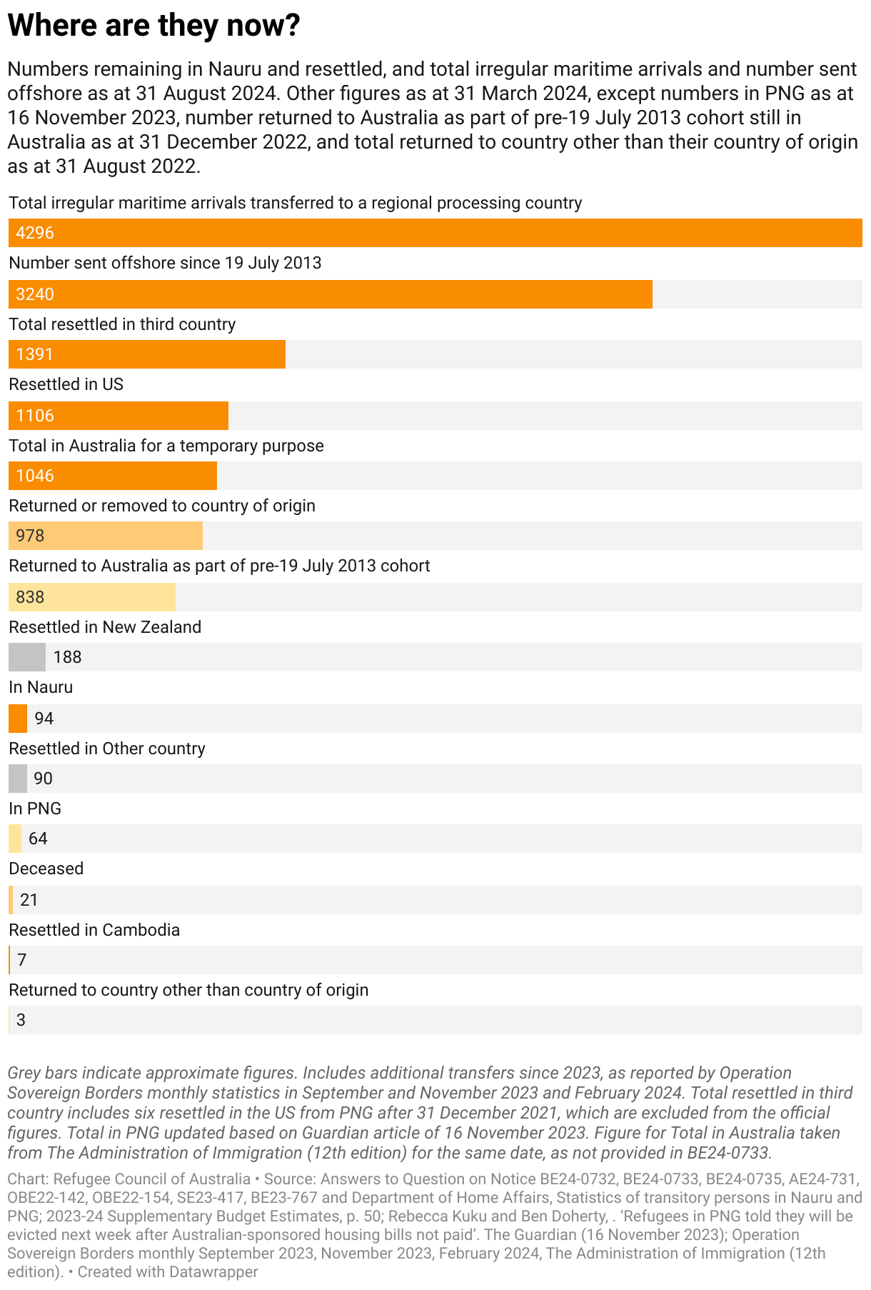 Numbers remaining in Nauru and resettled, and total irregular maritime arrivals and number sent offshore as at 31 August 2024. Other figures as at 31 March 2024, except numbers in PNG as at 16 November 2023, number returned to Australia as part of pre-19 July 2013 cohort still in Australia as at 31 December 2022, and total returned to country other than their country of origin as at 31 August 2022.