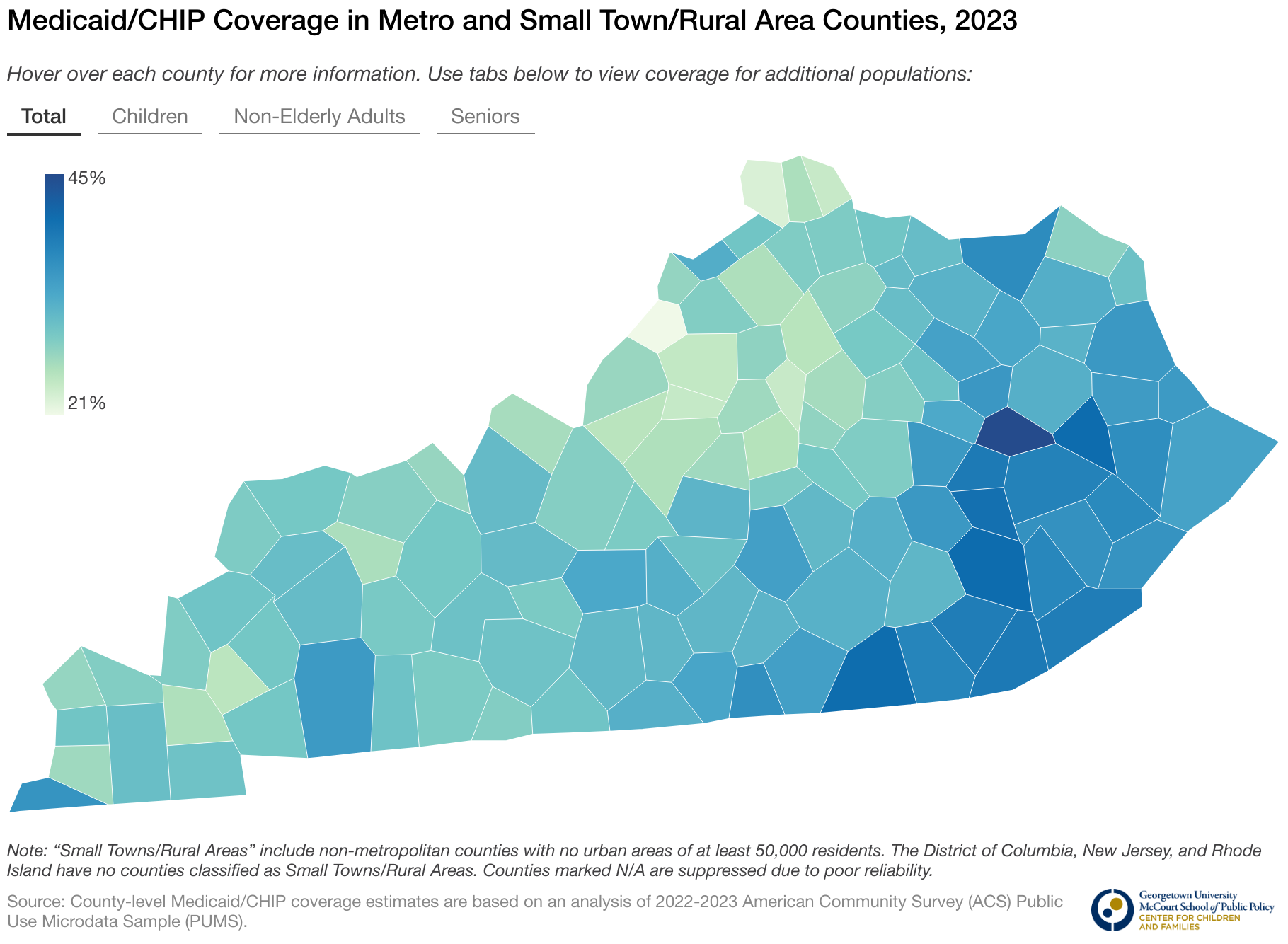 Hover over each county for more information. Use tabs below to view coverage for additional populations: Total Children Non-Elderly Adults Seniors
