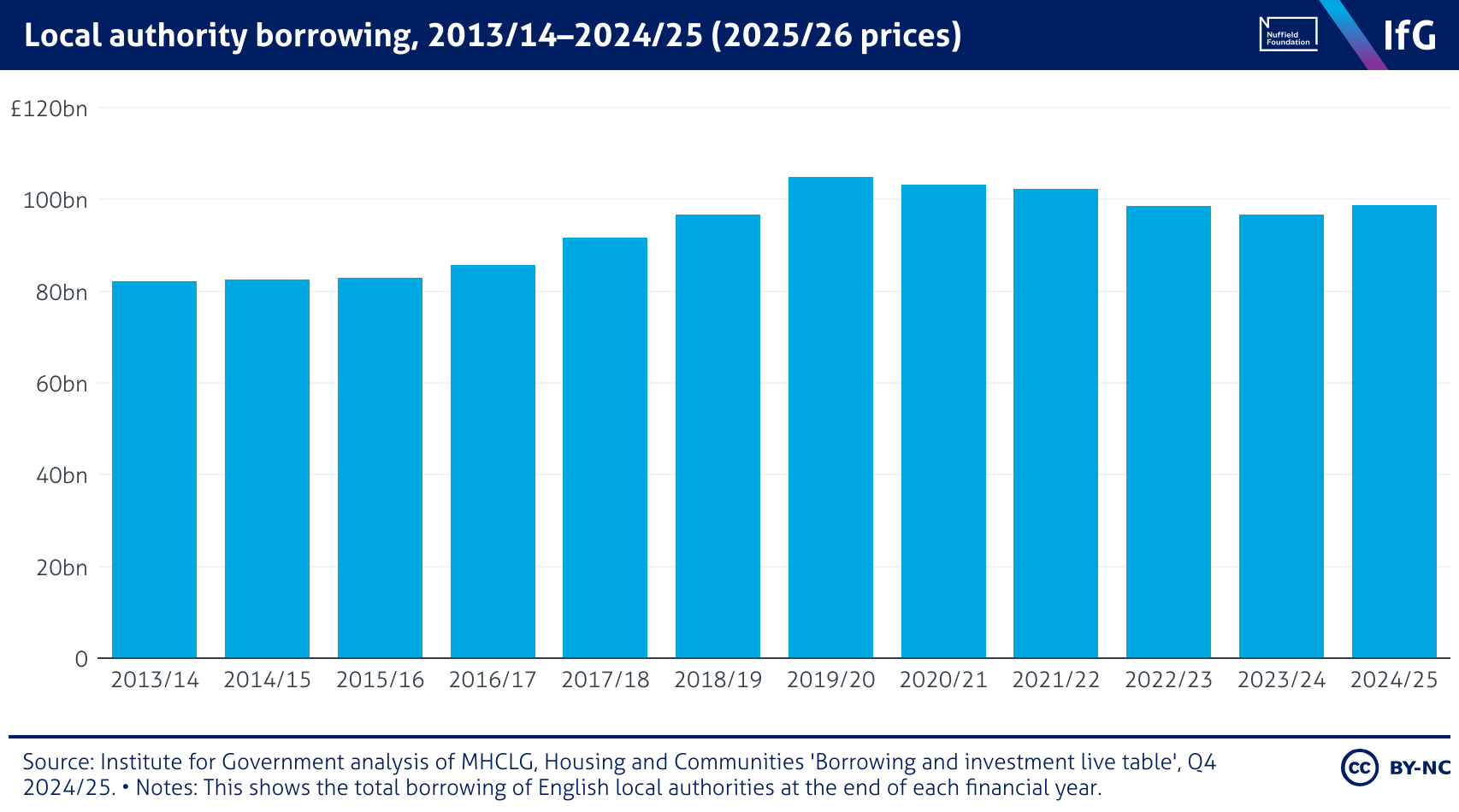 A column chart from the Institute for Government of local authority borrowing, 2013/14–2024/25 (2025/26 prices), where borrowing increased from £82.2 billion in 2013/14 to peak at £104.8 bn in 2019/20. In 2024/25, it stands at £98.8bn