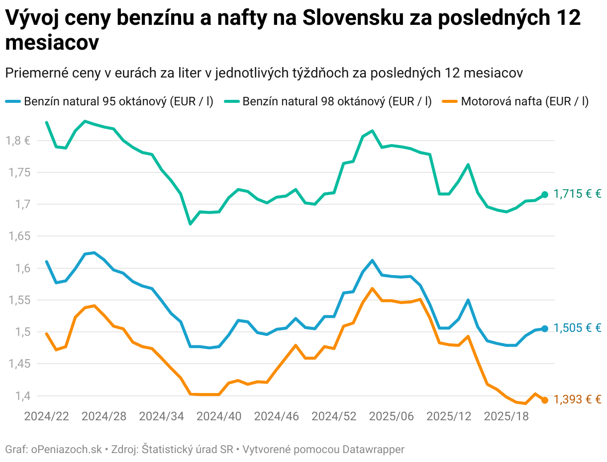 Priemerné ceny v eurách za liter v jednotlivých týždňoch za posledných 12 mesiacov