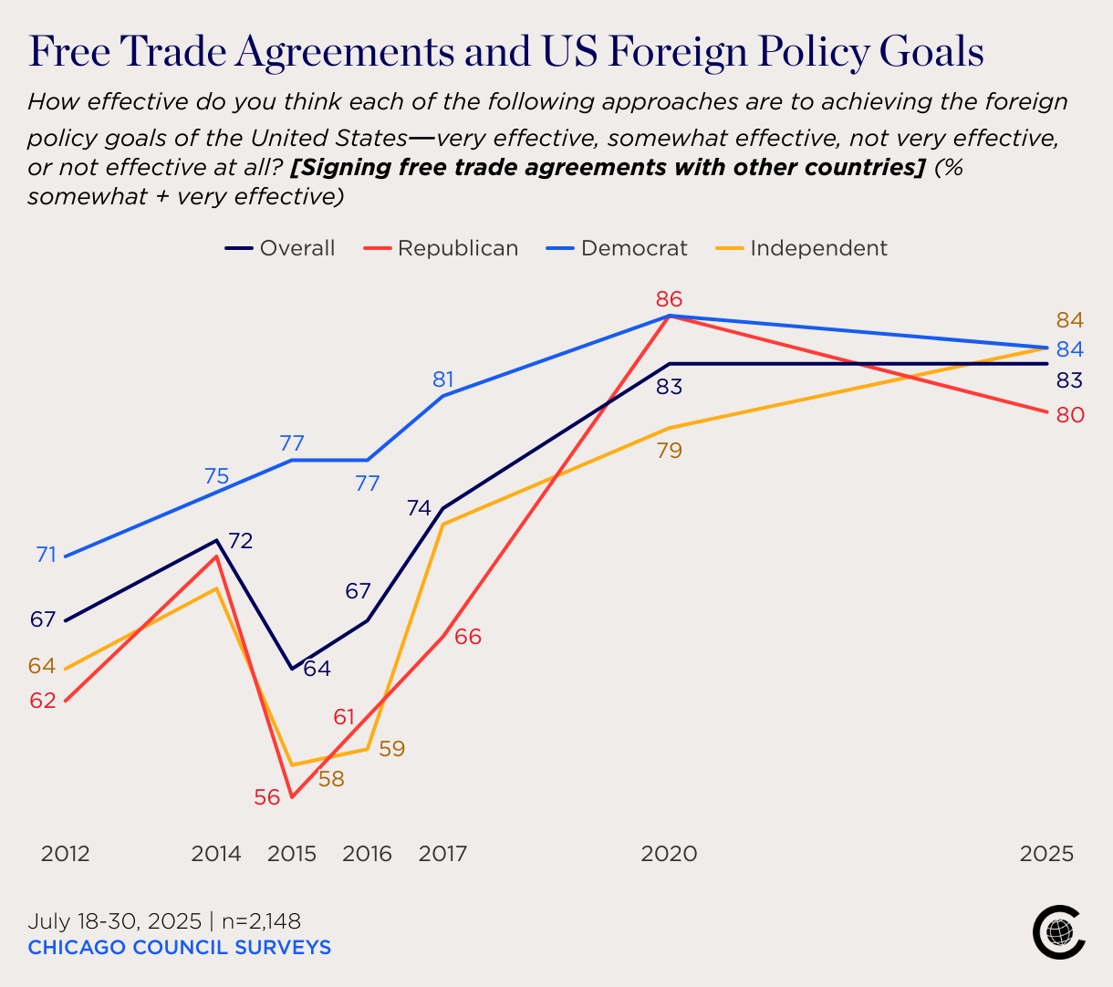 How effective do you think each of the following approaches are to achieving the foreign policy goals of the United States—very effective, somewhat effective, not very effective, or not effective at all? [Signing free trade agreements with other countries] (% somewhat + very effective)