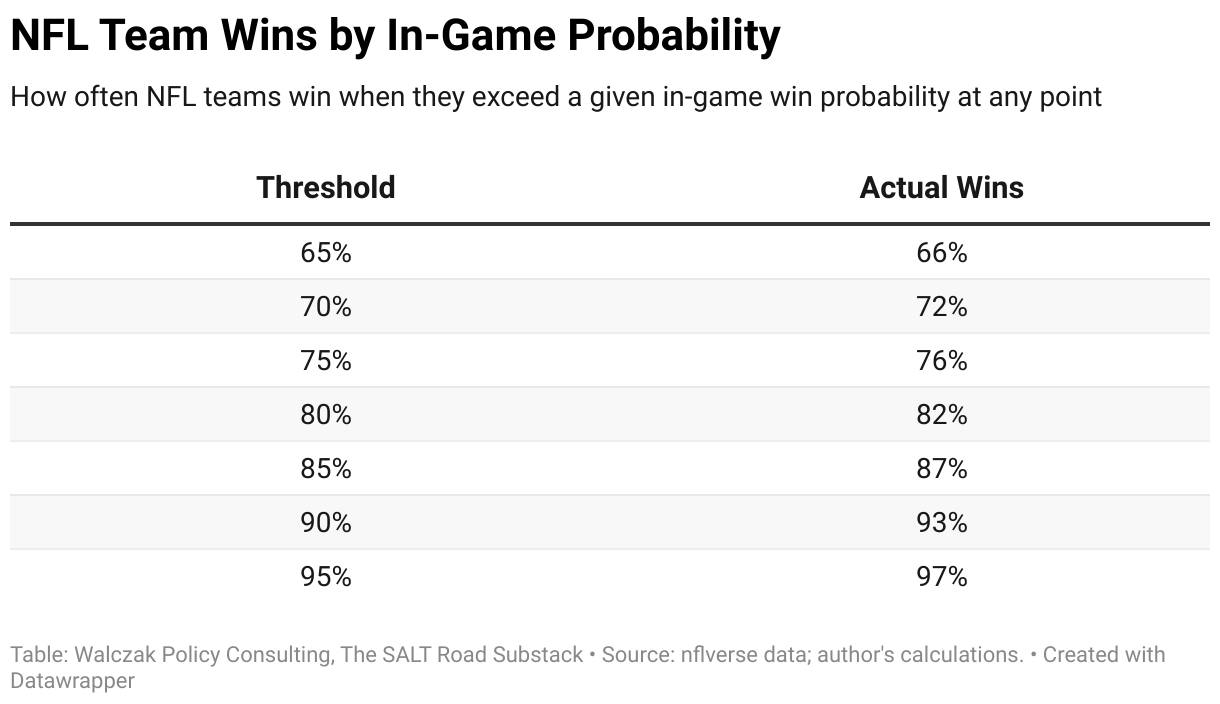 How often NFL teams win when they exceed a given in-game win probability at any point