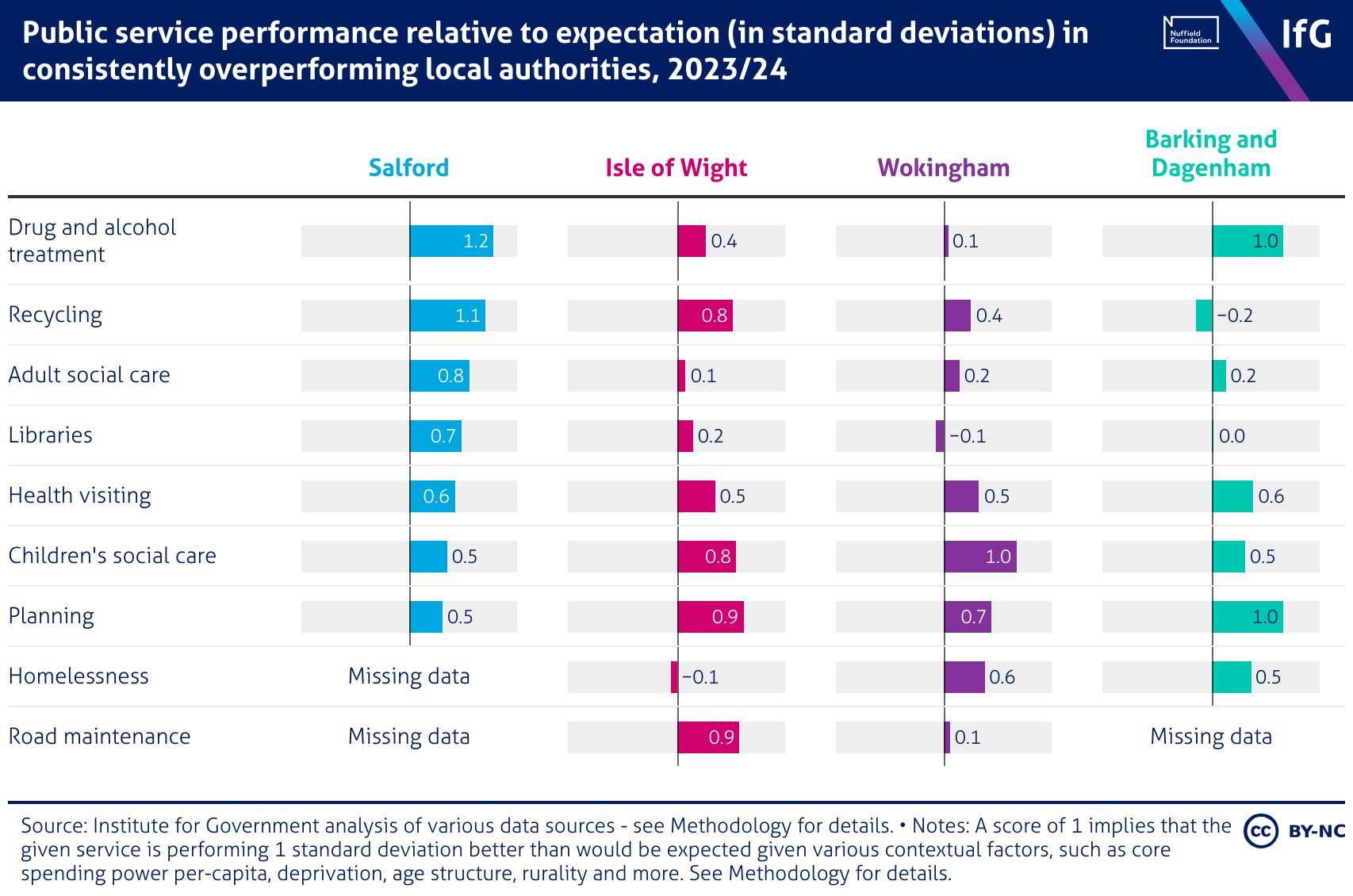 A split bar chart from the Institute for Government of public service performance relative to expectation (in standard deviations) in consistently overperforming local authorities, 2023/24, where Salford overperforms on all services for which we have data (although it is missing data on homelessness and road maintenance), and Wokingham, the Isle of Wight and Barking and Dagenham overperform on all but one service for which we have data.